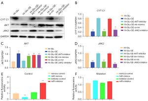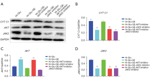 WB results showed that the expression of CYT C1 was significantly decreased after adding GE compared with that under hyperglycemia. The expression of CYT C1 was significantly increased after adding GE and AKT inhibitor, decreased after adding GE and JAK2 inhibitor, and decreased after adding GE combined with AKT inhibitor and JAK2 inhibitor (P<0.05; Figure 7A,7B). The expression of AKT in RPE cells was significantly increased after adding GE (P<0.05), and decreased after adding GE and AKT inhibitor (P<0.05). The expression of AKT was not significantly different from the GE group after adding JAK2 inhibitor, but the expression of AKT decreased significantly after adding GE combined with AKT inhibitor and JAK2 inhibitor (P<0.05; Figure 7C). The expression of JAK2 was significantly decreased compared with that under hyperglycemia after adding GE, and increased significantly after adding GE and AKT inhibitor. The expression of JAK2 was significantly decreased after adding GE and JAK2 inhibitor, and also decreased (P<0.05) after adding GE combined with AKT inhibitor and JAK2 inhibitor (Figure 7D).