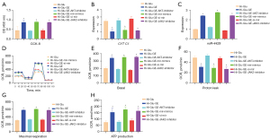 In this study, the corresponding hypothesis was verified by constructing miR-4429-mimics and si-miR-4429 lentiviral vectors and combining inhibited or activated with AKT and JAK2 signaling. CCK-8 assay results showed that compared with adding GE under hyperglycemia, the cell activity was significantly inhibited after adding AKT inhibitor, increased after adding miR-4429-mimics, and inhibited after adding si-miR-4429 (P<0.05; Figure 9A). RT-PCR showed that the expression of CYT C1 was significantly increased after adding AKT inhibitor, decreased after adding miR-4429-mimics, and increased after adding si-miR-4429 (P<0.05; Figure 9B). RT-PCR showed that the expression of miR-4429 was significantly increased after adding GE, and inhibited after adding AKT inhibitor (P<0.05; Figure 9C). The results of energy metabolism analysis showed that the basal respiration rate, maximum respiration capacity, and ATP synthesis capacity were significantly decreased after adding AKT inhibitor (P<0.05), increased after adding miR-4429-mimics, and decreased after adding si-miR-4429 (P<0.05). Mitochondrial permeability was significantly increased after adding AKT inhibitor, decreased after adding miR-4429-mimics, and increased after adding si-miR-4429 (P<0.05; Figure 9D-9H).