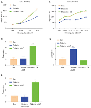 The results of ERG showed the intensity and amplitude of ERG wave A and wave B in each group. The results showed that the amplitudes of A and B waves in diabetic mice decreased significantly (P<0.05), while the amplitudes of A and B waves in diabetic mice increased significantly after adding GE (P<0.05; Figure 11A,11B). RT-PCR results showed that after adding GE, the expression of AKT and miR-4429 in RPE cells was significantly increased (P<0.05), while the expression of JAK2 was significantly decreased (P<0.05; Figure 11C-11E).