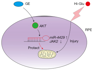 On this basis, the present study investigated whether GE could protect the retinal pigment epithelium from mitochondrial damage under hyperglycemic conditions through the AKT pathway mediated by the miR-4429/JAK2 signaling axis. We present the following article in accordance with the ARRIVE reporting checklist (available at https://atm.amegroups.com/article/view/10.21037/atm-22-2219/rc).