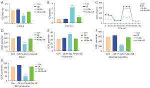 The CCK-8 assay showed that the activity of RPE cells was significantly decreased under hyperglycemia (P<0.05), but increased after adding GE (P<0.05; Figure 1A). RT-PCR results showed that the expression of CYT C1 in RPE cells under hyperglycemia was significantly increased (P<0.05), and the expression of CYT C1 in RPE cells was significantly decreased after adding GE (P<0.05; Figure 1B). The comparison of energy metabolism analysis results showed that the basal respiration rate, maximum respiration capacity, and adenosine triphosphate (ATP) synthesis capacity were significantly decreased under hyperglycemia (P<0.05), and all significantly increased after adding GE (P<0.05). Energy metabolism analysis showed that mitochondrial permeability increased in RPE cells under hyperglycemia (P<0.05), and decreased significantly after adding GE (P<0.05; Figure 1C-1G).
