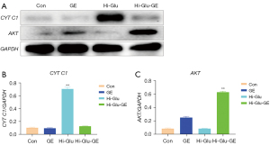 WB results showed that the expression of CYT C1 was significantly increased under hyperglycemia (P<0.05), and decreased significantly after adding GE (P<0.05; Figure 2A,2B). The expression of AKT in RPE cells was significantly increased after adding GE (Figure 2C).