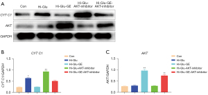 WB results showed that the expression of CYT C1 was increased in RPE cells under hyperglycemia, and decreased significantly after adding GE, while the expression of CYT C1 was significantly increased after adding GE and AKT inhibitor (P<0.05; Figure 4A,4B). The expression of AKT in RPE cells increased significantly after adding GE (P<0.05), and decreased significantly after adding GE and AKT inhibitor (P<0.05; Figure 4C).