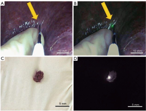 Ultra-small residual tumors play a major role in determining patients’ postoperative prognosis and survival. Once the dysplastic lesion is larger than 2 cm, the chance of cure decreases significantly (5). Subcentimeter tumors have been previously identified in an ovarian cancer animal xenograft model (6) and in phase I clinical trials using second window ICG in thoracic cancer (7). To the best of our knowledge, herein we have reported for the first time the case of an early hepatocellular carcinoma (HCC) focus of about 430 µm that was visualized during real-time image-guided surgery. Regardless of using electromagnetic, ultrasonic, or fluorescence techniques, this submillimeter lesion was detected on the liver of a 55-year-old man diagnosed with a space-occupying neoplasm of the liver. The case is a part of a clinical study assessing the role of NIR imaging in guiding small-lesion detection during surgery. To date, the study has involved 13 patients (age range, 45–70 years) diagnosed with hepatocarcinoma.