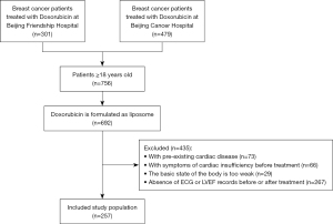 We conducted a multicenter, retrospective study of hospitalized patients by collecting electronic medical records from Beijing Friendship Hospital and Beijing Cancer Hospital. The study included breast cancer patients who were treated with doxorubicin liposomes during hospitalization from January 2018 to July 2021 from Beijing Cancer Hospital and Beijing Friendship Hospital, Capital Medical University. The liposome dosage form of doxorubicin alters the tissue distribution and pharmacokinetic characteristics of the free drug (5), which may result in a reduced likelihood of cardiotoxicity, thus the results of the analysis may be unreasonable if patients treated with both liposome and non-liposome dosage forms were included in the study.