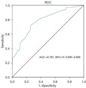 To evaluate the discriminability of the risk model, the receiver operating characteristic (ROC) curves were constructed, and the AUC was calculated. Hosmer-Lemeshow test and calibration plot were used to evaluate the calibration effect of the risk model. All data analyses were performed using the software SPSS 25.0 (IBM Corp., Armonk, NY, USA). A two-sided P<0.05 was considered statistically significant.