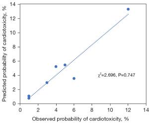 Risk scoring was categorized into four levels to improve the clinical application of the risk score model: low risk (score 0 and 2), medium–low risk (score 3–5), medium–high risk (score 6–7), and high risk (score 8–9 and 12). The actual incidence and predicted probability of cardiotoxicity according to the four risk classes was shown in Figure S1, and the trend of higher risk level linking to a higher incidence of cardiotoxicity was apparent.