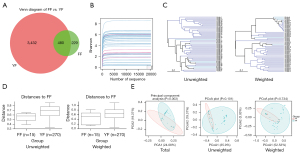 We also used hierarchical clustering to visualize relationships among the TF and FF samples according to the average linkage. The relationships among the samples based on the similarity of the microbial composition, which was calculated by the UPGMA, are presented in a dendrogram (see Figure 1C). Additionally, a box plot shows the differences between the two groups using a METAGE Nassist pipeline, and the data revealed that the distance was significantly lower in the FF group than the YF group (see Figure 1D). Conversely, the PCoA of the weighted UniFrac distances was used to compare the bacterial communities between samples from the FF group (red circles; n=5) and YF group (blue circles; n=45). As Figure 1E shows, while the bile of the YF and FF communities were similar for a large portion of intersection, which indicates that the YF and FF samples shared bacterial communities, there was a clear separation between the two groups (see Figure 1E). Based on the above analyses, we confirmed that microbial signatures were available for the patient groups and could be used to distinguish among the samples.