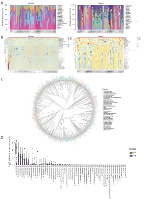 Second, the distribution of the top 5 most abundant bacteria is shown in a Circos diagram. The left (large) semicircle denotes the species composition (the inner bands signify the different taxa, and the outer bands signify the species), and the right (small) semicircle denotes the taxonomic distribution ratio of the species in different samples (the inner bands signify the species, and the outer bands signify the different taxa), and the length denotes the distribution of the samples. Compared to the YF patients, the FF patients had observably higher proteobacteria, and prominently lower Bacteroidetes and actinobacteria (see Figure 3B).