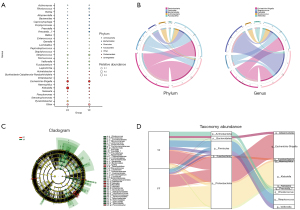 Additionally, to study the phylogenetic relationships between the microbiota, we used a phylogenetic tree to display the evolutionary relationship. Different branches represent different levels of genus classification. Different genera of the same color indicate that branches belong to the same phylum. The genetic similarity of branches is negatively correlated with their distance in the clade (see Figure 2C). Additionally, a bar plot displays the differences of the microorganisms at each level, and indicates whether there was a significant difference between the groups of the species (P<0.05). As Figure 2D shows, the bacteria that exhibited a relatively high abundance included klebsiella, rhodococcus, prevotella, alloprevotella, acinetobacter, stenotrophomonas, curvibacter, novosphingobium, and raoultella.