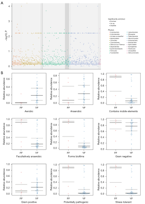 Additionally, we further predicted the differential flora at the phylum level and the microbial-associated phenotypes. The Manhattan plots show the abundance of the microbiota enriched in the FF bile relative to the YF bile. The most different bacterial community was found in the proteobacteria (see Figure 4A). Next, scatter plots were used to predict the different phenotypes in the YF and FF groups, and the results showed that compared to the YF group, the relative abundance of the aerobic was reduced, while the relative abundances of the stress tolerance, content of mobile elements, formation of biofilms, potentially pathogenic, and facultatively anaerobic were elevated in FF the group; however, the relative abundance of anaerobic, gram negative and gram positive did not change between the two groups (see Figure 4B).