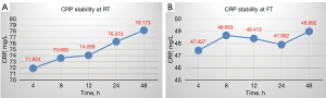 The BC-7500 CRP samples at room temperature and refrigerated environment were stable (refer to Tables 6,7). The CRP parameters showed a slight increasing trend in the room temperature environment, which was more obvious after 12 hours. The average relative deviation of CRP at 24 and 48 hours were 6.10% and 8.69%, respectively, compared to the 4-hour test results. The CRP test results in the refrigerated environment showed little fluctuation with time, and its average relative CRP deviation at 24 and 48 hours were 1.00% and 3.30%, respectively (refer to Figure 5).