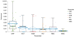 WBC, white blood cell; RBC, red blood cell; HGB, hemoglobin; HCT, hematocrit; PLT, platelet; CRP, C-reactive protein; 95% CI, 95% confidential interval.
