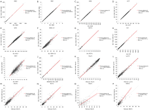 WBC, white blood cell; Neu%, neutrophil percentage; RBC, red blood cell; HGB, hemoglobin; HCT, hematocrit; MCV, mean corpuscular volume; RDW-CV, the variable coefficient of red cell volume distribution width; RET%, reticulocyte; PLT, platelet; MPV, mean platelet volume; CRP, C-reactive protein; Neu%, neutrophil percentage; Lym%, lymphocyte percentage; Mon%, monocyte percentage; Eos%, eosinophil percentage; Bas%, basophil percentage; IMG%, immature granulocyte percentage; r, correlation coefficient; LoA, limits of agreement; 95% CI, 95% confidential interval.