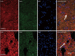 The survival and differentiation of transplanted hDPSCs in the spinal cord were also studied using immunofluorescence staining at 3 days, 2 weeks, and 4 weeks after hDPSC transplantation. HuNu expression was observed in injured spinal cords from the hDPSC/PRP and hDPSCs groups, which suggested that the transplanted hDPSCs could survive in injured spinal cord tissues (see Figure 4). Surviving hDPSCs were still visible in both the hDPSC groups 4 weeks after transplantation. Immunofluorescence with both HuNu-GFAP and HuNu-NeuN was also observed in some of the neurons after 4 weeks of therapy, proving that hDPSCs can differentiate into neurons in vivo.