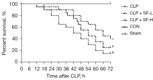 The overall survival rate of the Shenfu injection group was higher than that of the CLP only group at 72 hours after procedure (P<0.05). Moreover, no mice died in the sham groups treated with 0.9% NS or the normal control group (Figure 1).