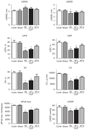 At 72 hours after the CLP procedure, LVEF, LVFS, LV end-systolic pressure (LVESP), and dP/dt were markedly impaired in the CLP-challenged mice compared with mice in the control or sham groups (all P<0.05). Administration of Shenfu injection attenuates the CLP-induced decreases in LVEF, LVFS, dP/dt, and LVESP (P<0.05).