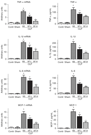Previous research shows that cardiac dysfunction is a critical complication in the setting of sepsis and that the inflammatory signaling could be the major mediator that leads to this pathological process (16). As presented in Figure 3, the levels of TNF-α, IL-1β, IL-6, and MCP-1 in myocardium of septic mice were assessed by PCR and enzyme-linked immunosorbent assay (ELISA) analysis. The myocardial TNF-α, IL-1β, IL-6, and MCP-1 mRNA were dramatically increased in septic mice after the CLP procedure compared to those of the control and sham groups (Figure 3; P<0.05). All these increased mRNA levels of inflammatory cytokines were attenuated in septic mice treated with Shenfu injection (Figure 3; P<0.05). This pattern of mRNA expression change was also seen at the protein level, indicating that administration of Shenfu injection suppressed the inflammatory responses in septic hearts (Figure 3).