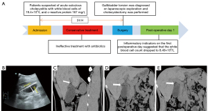 Depending on the related literature, it is reported that the incidence of gallbladder torsion is about 1 in 350,000 hospitalized patients (1). Generally speaking, gallbladder torsion is more common in adult patients (84% over 18 years old), and the proportion of women is higher than that of men (2). As the gall bladder rotates, the cystic artery becomes involved, blocking the blood supply. Early diagnosis is important since this rare morbid structure can develop rapidly, leading to sepsis and septic shock, and the mortality rate can reach 6% (3). In this case report, the preoperative diagnosis of gallbladder torsion was not clear. Of the more than 500 case reports published worldwide, only 10% of patients were diagnosed before surgery (3,4). Although there are difficult in preoperative diagnosis, we can still obtain diagnostic clues from typical ultrasound and abdominal computed tomography (CT). We hope that by describing this case we can contribute to the accumulation of a typical image database of this rare lesion, and help inexperienced clinicians to perform preoperative evaluation of this uncommon condition, so as to obtain a complete and accurate diagnosis. We present the following case in accordance with the CARE reporting checklist (available at https://atm.amegroups.com/article/view/10.21037/atm-22-1425/rc).