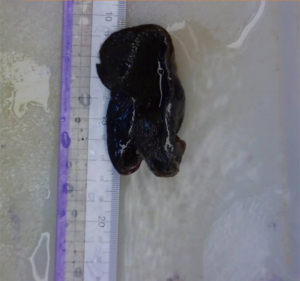 Gallbladder torsion was diagnosed, and cholecystectomy was performed. There was no major intraoperative complications during the operation. Inflammatory indicators on the first postoperative day suggested that the white blood cell count dropped to 8.49×109/L. The patient recovered well without any postoperative complications and was discharged on the second day after surgery. Postoperative pathological results showed full-thickness hemorrhage and necrosis of the gallbladder wall and unclear structure. It was diagnosed as gallbladder ischemic infarction (Figure 3). All procedures performed in this study were in accordance with the ethical standards of the institutional and national research committee(s) and with the Declaration of Helsinki (as revised in 2013). Written informed consent was obtained from the patient for publication of this case report and accompanying images. A copy of the written consent is available for review by the editorial office of this journal.
