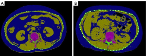 As shown in Table 1, vBMD in the PHPT group was obviously lower than that in the HC group (114.30±41.71 vs. 136.92±42.23 mg/cm3; P=0.002). It demonstrated that lumber’s trabecular bone was impaired. Meanwhile, compared with controls, the PHPT group had significantly higher TAT (261.98±74.65 vs. 236.69±69.00 cm2; P=0.033) and a suggestive significant trend of higher SAT (120.81±40.19 vs. 109.94±36.83 cm2; P=0.085) and VAT (141.17±48.11 vs. 126.75±50.50 cm2; P=0.085). Figure 1 shows 2 representative images of the abdominal adipose tissue distribution in the patients and controls.