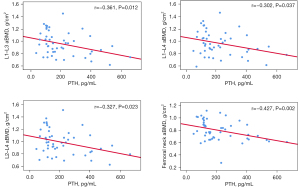 Nonparametric Spearman rank correlation coefficient analysis showed that the vBMD was significantly and negatively correlated with PTH level in all participants (r=−0.254; P<0.001), but not those in the PHPT group (r=−0.182; P=0.215) or in the HC group (r=−0.153; P=0.068). Nevertheless, our data indicated that PTH level was significantly and negatively associated with aBMDof lumbar spine of L1–L3, L1–L4, L2–L4, and femoral neck in the PHPT group, as indicated in Figure 2.