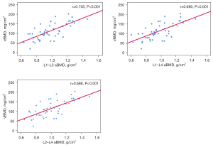 All statistical analyses were performed with the software SPSS 26.0 (IBM Corp., Armonk, NY, USA) and the significance level was set at two-sided P<0.05. Continuous variables were tested for normality with the Kolmogorov-Smirnov test and represented by mean ± SD (normally distributed) or medians with 25th and 75th percentiles (abnormally distributed). Independent samples T-test (normally distribution) and Mann-Whitney U test (abnormally distribution) were used for comparisons, as appropriate. Categorical variables were expressed as frequency (percentage) and were compared using the chi-squared test. Associations with BMD and clinical parameters were investigated using Spearman correlation analysis and Multiple linear regressions. Pearson correlation analysis was used to investigate the association between QCT-derived vBMD and DXA-derived aBMD. Weighted kappa consistency analysis was used to clarify the agreement between QCT and DXA. A weighted kappa value of 0.00–0.20 indicated slight agreement; 0.21–0.40, fair agreement; 0.41–0.60, moderate agreement; 0.61–0.80, substantial agreement; 0.81 to less than 1.00, almost perfect agreement; and 1.00, perfect agreement.