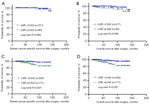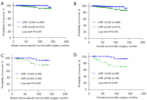 The mean follow-up time was 67±38 months with a range of 3–144 months. Patients with an LNR ≥0.042 exhibited worse BCSS and OS than others (P<0.001, <0.001, respectively; Figure 3) in pT1/2 breast cancer. To further explore the predicted prognosis of the LNR, we further analyzed the subgroup survival according to the LNR status. Among patients with pT1 breast cancer, the LNR ≥0.042 group showed significantly worse OS than the LNR <0.042 group whereas BCSS was comparable between the two groups (P=0.039, 0.885, respectively; Figure 4). The LNR ≥0.042 group were also observed to have worse BCSS and OS in patients with pT2 breast cancer (P=0.001, 0.001, respectively; Figure 4). In addition, among patients with non TNBC and TNBC subtypes, the LNR ≥0.042 group also exhibited worse BCSS and OS than the LNR <0.042 group (P=0.003, 0.001, and P=0.032, 0.001, respectively; Figure 5).