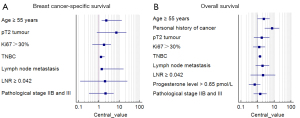 We used a ROC curve to define the cut-off value of circulating sex hormone concentration in postmenopausal patients and tumor markers for BCSS and OS, and the cut-off values are listed in Table 4. As the cut-off of Ki67 at 30% had significant predictive potential for survival outcome, this was used for analysis (17). The results of univariate and multivariate Cox proportional regression analysis for BCSS and OS are summarized in Table 5. In univariate analysis, an unfavorable BCSS was related to older age (P=0.015), pT2 stage (P=0.028), Ki67 >30% (P=0.031), TNBC subtype (P=0.043), N2 and N3 stage (P<0.001), LNR ≥0.042 (P=0.001), and advanced pathological stage (P<0.001). An unfavorable OS was associated with older age (P=0.003), personal history of cancer (P=0.002), pT2 stage (P=0.048), Ki67 >30% (P=0.032), TNBC subtype (P=0.031), N2 and N3 stage (P<0.001), LNR ≥0.042 (P<0.001), progesterone level >0.65 pmol/L (P=0.013) and advanced pathological stage (P<0.001). Multivariate analysis demonstrated age more than 55 years (HR =4.281, 95% CI: 1.353–13.545, P=0.013), TNBC subtype (HR =1.449, 95% CI: 1.097–1.914, P=0.009), and lymph node metastasis (HR =4.720, 95% CI: 1.358–16.398, P=0.015) were independent predictors of reduced BCSS (Figure 6A), while for OS in T1/2 breast cancer patients, a personal history of cancer (HR =7.235, 95% CI: 2.623–19.956, P<0.001) and TNBC subtype (HR =1.364, 95% CI: 1.094–1.699, P=0.006) were independent predictors (Figure 6B).