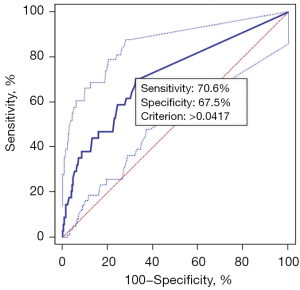 | Characteristics | AUC | Youden index | Cut-off | Sensitivity | Specificity | P |