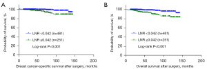 While pN status was a crucial factor for anatomic TNM staging for the prediction of metastasis and prognosis of breast cancer patients, recent studies suggest the LNR is more accurate than pN status by reducing the variability of lymph node dissection and the standardization may be set up in the near future (6,10,18). We identified the cut-off value of the LNR as 0.042 based on our cohort, which was lower than that be reported in other studies, and may be because a greater percentage of our patients had early-stage disease, and there were different patient sources between institutions (19,20). Furthermore, we firstly focused on all stage patients with or without lymph node metastasis. Our results showed a higher LNR obviously correlated with older age, larger tumor size, N stage, pathological type of IDC, Ki67 ≥14%, subtype, and pathological stage, which is consistent with previous studies (20,21). Moreover, in line with other studies, our results showed the LNR presented as a superior predictor in the survival outcome of pT1/2 breast cancer regardless of BCSS or OS (19,22,23). Breast cancer is considered a heterogeneous neoplasm, and different molecular subtypes are associated with distinct lymph node metastasis. In some molecular subtypes, the increased risk is observed in the lymph node involvement group (24,25). Liao and colleagues demonstrated pNs have no association with breast cancer whereas the LNR had a higher ratio and worse survival outcome in molecular subgroups (20). In our cohorts, a lower LNR exhibited extended BCSS and OS regardless of TNBC and non-TNBC grouping. Additionally, patients with an LNR above the threshold had worse OS than patients below the threshold, but this did not relate significantly with BCSS in pT1 patients. Larger cohort studies are required to verify the results.