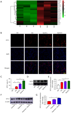 The heatmap shows that STC1 was identified as one of several hypoxia-responsive genes related to hypoxia-driven angiogenesis (Figure 5A). Several reports found that STC1 could increase vascular density and is associated with angiogenesis (12,17-19). To investigate whether Sal B promotes angiogenesis by activating STC1, we evaluated the expression of STC1 by immunohistochemical staining and western blot analysis in vivo and in vitro. Immunohistochemical staining showed increased STC1 expression in MCAO rats compared with sham rats, and Sal B treatment further increased STC1 expression (Figure 5B,5C). Western blot analysis (Figure 5D,5E) confirmed an increase in STC1 expression in MCAO rats that was further increased by low and high doses of Sal B. Similarly, Sal B administration increased STC1 levels of HUVECs compared with the group exposed to normoxia and hypoxia (Figure 5F,5G). The aboce results indicated that Sal B administration enhances angiogenesis in ischemic stroke via targeting STC1.