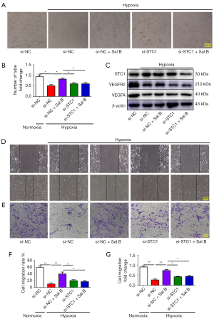 Human umbilical vein endothelial cells (HUVECs) (ATCC, Manassas, VA, USA) were cultured in endothelial-cell medium supplemented with 5% FBS and 1% endothelial-cell growth supplement. Cells were cultured in a humidified normal air, 5% CO2 incubator or a humidified 5% CO2, 1% O2 hypoxic incubator at 37 ℃. The 'medium was changed every 48 h. si-STC1(5'- GACACAGUCAGCACAAUCATT-3'; 5'- UGAUUGUGCUGACUGUGUCTT-3') and si-NC duplexes (GeneChem, Shanghai, China) were transfected into HUVECs by using Lipofectamine 3000. Then, the cells were exposed to Sal B (50 µg/mL) for 24 h under hypoxic conditions (1% O2, 5% CO2).