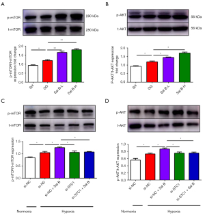 The AKT/mTOR signaling pathway is involved in cell migration and angiogenesis. In particular, accumulating evidence has shown that the AKT/mTOR signaling pathway plays an important role in stroke-induced angiogenesis (5,20). Thus, we evaluated the phosphorylation of AKT and mTOR in HUVECs and the infarct area of rats. Low and high doses of Sal B evidently enhanced the phosphorylation of mTOR and AKT in rats compared with sham and MCAO rats (Figure 7A,7B). Similarly, Sal B treatment increased p-mTOR levels and phosphorylated (p)-AKT in HUVECs (Figure 7C,7D) and STC1 inhibition reversed the upregulating effects of Sal B on p-AKT and p-mTOR levels.