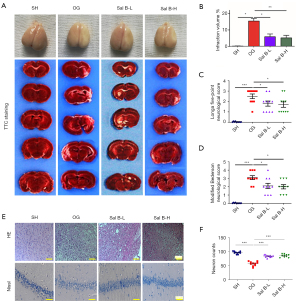 To ascertain the role of Sal B in ischemic stroke, we detected infarct volumes and neurological deficit scores in rats 3 weeks after surgery. TTC staining showed significantly extensive infarct volumes in the MCAO group compared with the sham group, while Sal B at low and high doses significantly reduced the area of infarction (Figure 1A,1B). Moreover, using the Longa five-point neurological and the modified Bederson neurological score system, we found that Sal B administration could significantly improve behavioral motor deficits compared with the MCAO group (Figure 1C,1D). H&E staining in the cerebral cortex region and Nissl staining in the hippocampus region were performed to observe the neuroprotective function of Sal B. Compared with normal nerve cells in sham rats, nerve cells in the infarct area were extensively damaged in MCAO rats, and the surviving neuron number was decreased significantly. However, Sal B administration alleviated the damage (Figure 1E,1F).