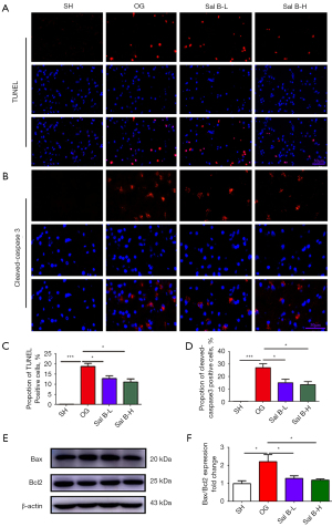 To assess the role of Sal B in neuronal apoptosis, we quantified neuronal cell death by cleaved-caspase3 immunohistochemistry and TUNEL staining. Apoptotic neurons were increased in number in the cerebral cortex region of MCAO rats compared with sham rats, and Sal B treatment markedly reduced the number of apoptotic neurons (Figure 2A-2D). Additionally, western blot analysis (Figure 2E,2F) further confirmed an increase in the apoptosis proteins Bax and Bcl2 in MACO rats, which was attenuated by Sal B administration.