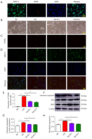 To investigate the protective effect of Sal B on neurons specifically, not glial cells, which are both major cellular components of brain tissue, we subjected primary cortical neurons to serum of rats from the four groups. Primary cortical neurons were identified by MAP-2 immunofluorescence staining, distinguished from glial cells identified by GFAP (Figure 3A). Then, we assessed primary neuronal cell apoptosis by co-staining for the neuronal marker MAP-2 and TUNEL. Consistent with our expected results, neurons exposed to hypoxia and serum from MCAO rats for 24 h showed higher levels of apoptosis compared with neurons from rats exposed to normoxia and serum from sham rats. Treatment with Sal B at low and high doses reduced the number of apoptotic neurons (Figure 3B-3D). We examined the activity of cleaved caspase-3, Bax and Bcl2 by western blot analysis. Similar to the results in vivo, in vitro, increased neuronal apoptosis under hypoxia and serum from MCAO rats could be attenuated by Sal B administration (Figure 3E-3H).