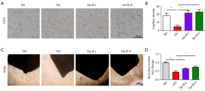 Neurogenesis is linked to angiogenesis in the ischemic brain. New blood vessels in the ischemic brain provide scaffolds to draw neuroblasts to the ischemic boundary region. Additionally, activated cerebral endothelial cells in angiogenic vessels secrete cytokines to attract neuroblasts to the region. The blockage of stroke-induced angiogenesis reduces neurogenesis (4,5). To evaluate the effect of Sal B on microcirculation in MCAO rats, we evaluated capillary density in vivo by CD31 immunohistochemistry. Ischemic stroke in rats substantially diminished vessel density at 3 weeks after surgery; however, Sal B administration increased the vessel density (Figure 4A,4B). Meanwhile, an aortic ring angiogenesis assay was performed to further assess the pro-angiogenesis effect of Sal B. The number of sprouts of aortic rings cultured with serum from MCAO rats was significantly inhibited under hypoxia, while serum from Sal B increased sprouts of aortic rings under hypoxia (Figure 4C,4D).