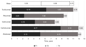 The total time lag (in years) for each drug was as follows: 12.90 for certolizumab; 12.48 for abatacept; 11.80 for tocilizumab; 9.93 for rituximab, and 8.57 for golimumab. Certolizumab, golimumab, and tocilizumab had a longer time course at T1, with abatacept and rituximab having longer durations at T2. The longest and shortest lags at T1 were for certolizumab (8.77 years) and rituximab (2.24 years). At T2, the lag for rituximab was 2.2 times longer than for certolizumab, which had the shortest lag in that stage. T3 was very similar for all drugs, being shorter than one year. The lag of the three steps for golimumab (8.57 years) was shorter than the T1 lag for certolizumab (8.77 years).