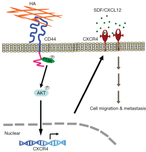 In addition to its adhesion function, CD44 also plays a key role in converting mechanical forces to biochemical signals. Sporadic studies have indicated that HA-CD44 mediates the migration of cancer cells, which may be related to the activation of AKT, ERK, and janus kinase 2 (JAK2)/signal transducer and activator of transcription 3 (STAT3) (34-36). We found that the HA-CD44 axis was able to activate the AKT and ERK pathway and stimulate HCC-LM3 cell migration, and similar results have been found in relation to breast cancer (36). Notably, the inhibition of AKT and ERK by AKT and ERK inhibitors, respectively, significantly blocked the chemotactic responses of the HCC cells triggered by HA or SDF-1α. Thus, the CD44-promoted increase in CXCR4 may be AKT/ERK-activity dependent, and play an essential role in assisting in the migration and invasion of HCC.