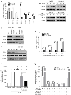 In this study, we found that CD44 was a potent predictor of EHM and the OS of HCC patients. Our in-vitro study showed that the knockdown of CD44 resulted in the significant inhibition of HCC cell migration, invasion, and colony formation. Additionally, our in-vivo study showed that HCC invasion and lung metastasis were significantly enhanced in the CD44 overexpression group. Mechanistically, among all of the CXCR1-7 molecules, silencing CD44 resulted in the maximum reduction of CXCR4 via the downregulation of the protein kinase B (AKT)/extracellular signal-regulated kinase (ERK) signaling pathway, which was supported by a reduced migration ability in response to stromal cell-derived factor 1α (SDF-1α). The inhibition of AKT and ERK significantly blocked the chemotactic responses of the HCC cells triggered by SDF-1α. In this study, we clarified the regulating mechanism between CD44 and CXCR4. To the best of our knowledge, we for the first time illustrated the relationship between CD44 and the CXCR4/SDF-1α axis in the EHM of HCC, which might become an important therapeutic target in the future. We present the following article in accordance with the ARRIVE and MDAR reporting checklists (available at https://atm.amegroups.com/article/view/10.21037/atm-22-2482/rc).