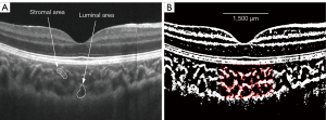 - Sonoda S, Sakamoto T, Yamashita T, et al. Choroidal structure in normal eyes and after photodynamic therapy determined by binarization of optical coherence tomographic images. Invest Ophthalmol Vis Sci 2014;55:3893-9. [Crossref] [PubMed]