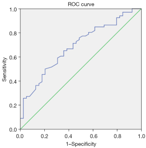 The ALC was collected within 1 week before immunotherapy and chemotherapy. Taking the patients’ 1-year OS as the endpoint, the ROC curve of ALC predicting OS was drawn (Figure 1). When the ALC cut-off value was 625 cells/µL, the Youden index was the largest (0.295), the sensitivity was 0.5, the specificity was 0.795, and the AUC was 0.688 [95% confidence interval (CI): 0.586–0.791, P=0.001].
