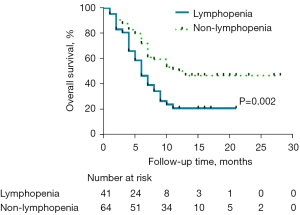 - Grossman SA, Ellsworth S, Campian J, et al. Survival in Patients With Severe Lymphopenia Following Treatment With Radiation and Chemotherapy for Newly Diagnosed Solid Tumors. J Natl Compr Canc Netw 2015;13:1225-31. [Crossref] [PubMed]