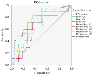 The accuracy of RT-related parameters (V20, V30, and V40 of the heart; V5, V10, and V20 of both lungs; and V10, V20, V30, and V40 of the mediastinum) in predicting the G4 Min ALC after RT was analyzed by ROC curves. As shown in Figure 3, the parameters corresponding to P<0.05 were included in the ROC curve, and the cut-off values for PTV volume, V20, V30, and V40 of the heart; V5, V10 of both lungs; and V10, V20, and V30 of the mediastinum were 521.2 cm3, 16.55%, 8.7%, 4.85%, 45.65%, 32.65%, 70.2%, 47.3%, and 45.3%, respectively (P=0.014, P=0.033, P=0.023, P=0.048, P=0.01, P=0.037, P=0.015, P=0.013, and P=0.021). V20 of both lungs and V40 of the mediastinum were not included in the ROC curves (P=0.074 and P=0.050). Using these cut-off values, the risk of developing G4 Min ALC during RT could be better predicted (Table 5).