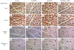 We immunohistochemically stained muscle sections for type I and type II fibers with monoclonal anti-myosin antibodies (Sigma-Aldrich, St. Louis, MO, USA). A Monoclonal anti-myosin antibody (skeletal, slow) was used for type I fibers, and a monoclonal anti-myosin antibody (skeletal, fast) was used for type II fibers. The sections were then immunostained with angiogenic markers using a polyclonal anti-VEGF antibody (A-20; Santa Cruz Biotechnology, Santa Cruz, CA, USA) and anti-PECAM-1 polyclonal antibody (M-20; Santa Cruz Biotechnology). The paraffin-embedded sections were cleared and dehydrated. Then, we washed the sections using phosphate-buffered saline (PBS). We inhibited endogenous peroxidases for 30 min by pre-incubation in 0.3% H2O2 in PBS. Non-specific protein binding was blocked upon treatment with PBS containing 10% normal horse serum (Vector Laboratories, Burlingame, CA, USA) for 30 min. We incubated the sections with the corresponding primary antibodies (1:200–1:500) at room temperature for 2 h. Then, we washed the sections three times using PBS. Afterward, the sections were incubated with the corresponding secondary antibody (1:100). Then, biotinylated anti-mouse IgG (Vector Laboratories) was added to the muscle sections for 1 h at room temperature. The sections were subsequently washed three times with PBS. We then incubated the sections with an avidin-biotin-peroxidase complex (ABC, Vector Laboratories) for 1 h and washed them three times with PBS, followed by a peroxidase reaction using 0.05 M Tris-HCl (pH 7.6) containing 0.01% H2O2 and 0.05% 3,3'-diaminobenzidine (DAB, Sigma-Aldrich). We counterstained the sections using hematoxylin and mounted them on slides. Finally, we inspected the slides by an Axiophot Photomicroscope (Carl Zeiss, Oberkochen, Germany) with an Axio-Cam MRc5 attachment (Carl Zeiss).