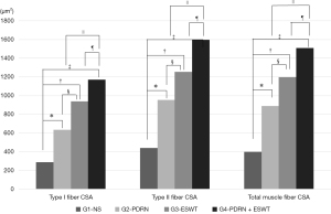 | Total muscle fiber CSA (μm2) | 399.0±20.5 | 888.3±12.1* | 1,197.2±14.5†§ | 1,509.3±20.5‡∥¶ |