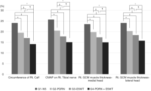 We found significant differences in the imaging, electrophysiological, and clinical parameters between the G1-NS and the other groups (P<0.05, Table 1). The mean atrophic changes (%) in the right medial and lateral GCM muscle thickness (Figure 3), right calf circumference, and CMAP amplitude of the right tibial nerve in the G4-PDRN + ESWT group were significantly lower than those in the other three groups (P<0.05, Table 1, Figure 4). The mean atrophic changes in calf muscle circumference, GCM muscle thickness, and CMAP amplitude of the tibial nerve in the G3-ESWT group were significantly lower than those in the G1-NS and G2-PDRN groups (P<0.05, Table 1, Figure 4). The mean atrophic changes in calf muscle circumference, GCM muscle thickness, and CMAP amplitude of the tibial nerve in the G2-PDRN group were significantly lower than those in the G1-NS group (P<0.05, Table 1, Figure 4).