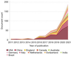 A rapid increase in the number of articles published in this field from 2011 to 2021 were detected, for which there was a wide global geographic distribution (Figure 2). The number of articles published in 2021 (161 articles) was about 35 times higher than that in 2011. Further, 54 countries contributed to publications on the application of AI in the ED and ICU. The United States of America (USA) published the most articles (n=201), followed closely by China (n=57).