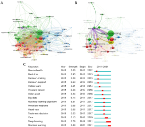 The top 15 keywords with the strongest burst values are summarized in Figure 3C. From 2011 to 2021, “big-data” had the strongest burst strength (strength: 6.74), followed by “machine learning algorithm” (strength: 5.51), “patient care” (strength: 4.51), “real time” (strength: 3.95), and “deep learning” (strength: 3.79). In 2017, the most frequently observed keyword bursts included “precision medicine” (strength: 3.66), “heart rate” (strength: 3.66), and “treatment decision” (strength: 3.05), to the exclusion of “big-data” and “machine learning algorithm”. The two keywords that maintained high burst values from 2019 to 2021 were “deep learning” (strength: 3.79) and “machine learning” (strength: 2.89).